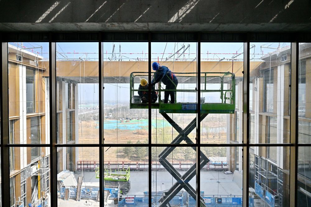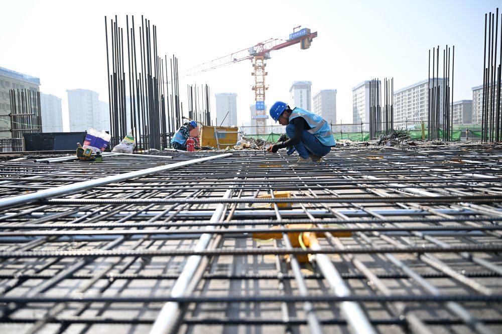 ↑ 3月25日,中建三局工人在中国矿产资源集团有限公司雄安总部项目建设现场施工。