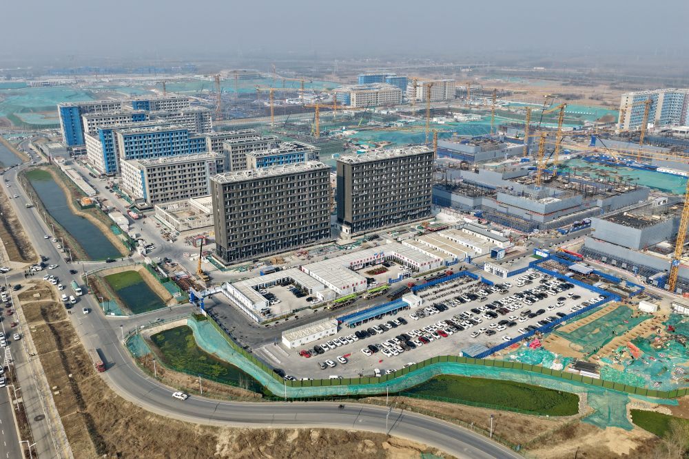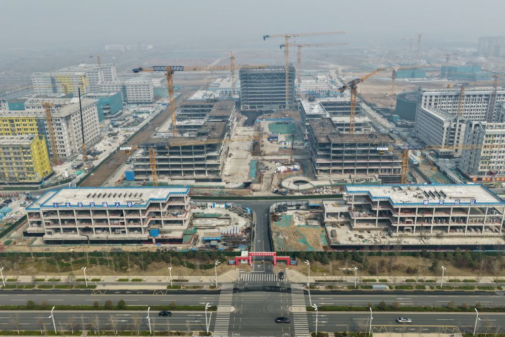 ↑ 北京交通大学雄安校区建设现场(3月25日摄,无人机照片)。