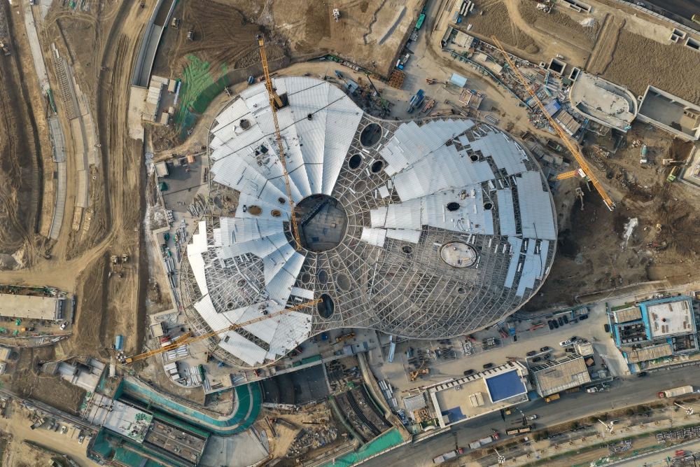 ↑ 雄安新区城市文化广场建设现场(3月25日摄,无人机照片)。