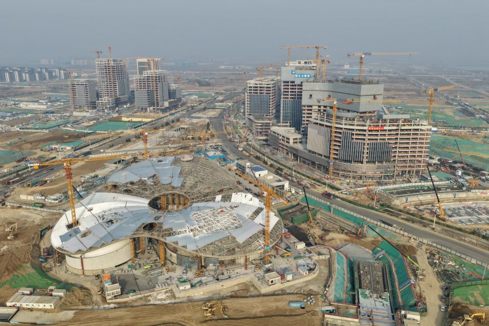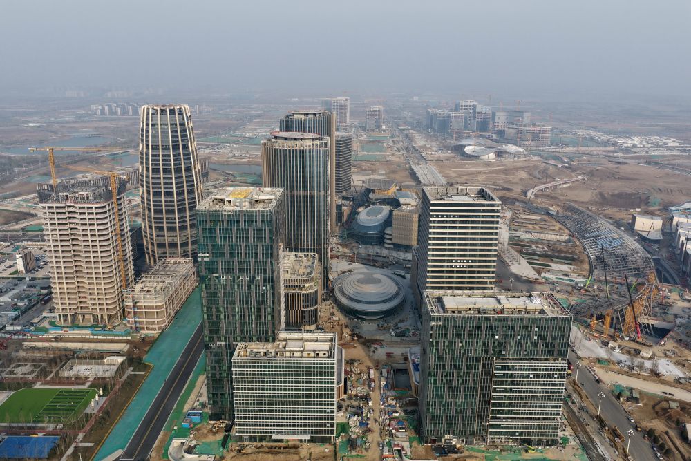 ↑ 雄安新区启动区国贸中心项目建设现场(3月25日摄,无人机照片)。